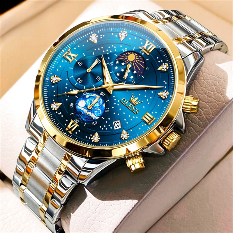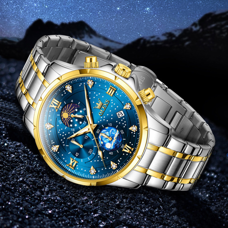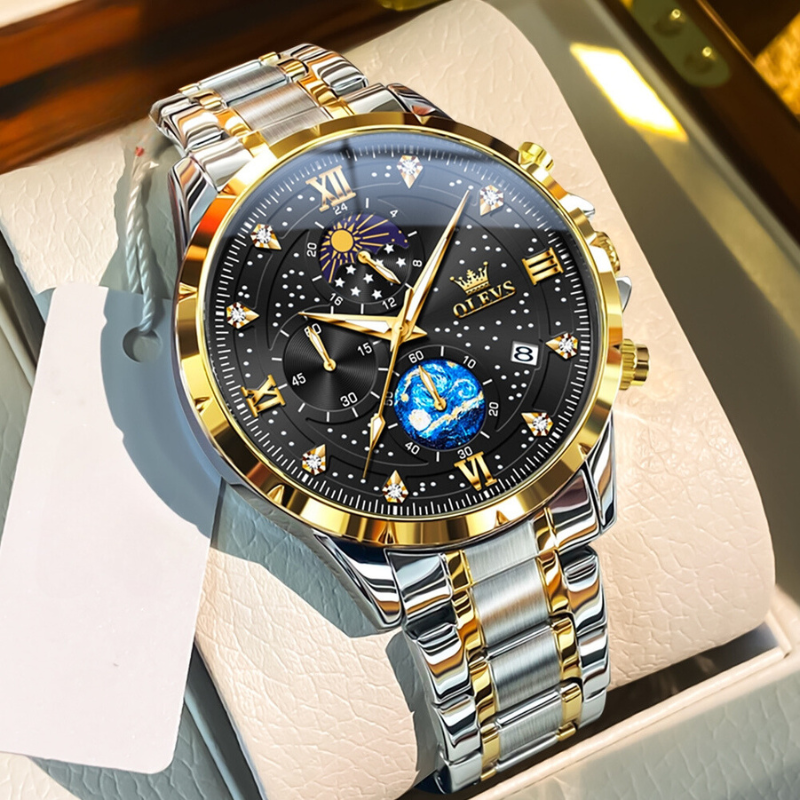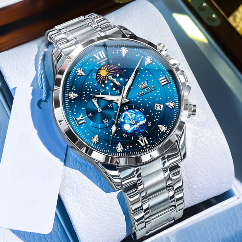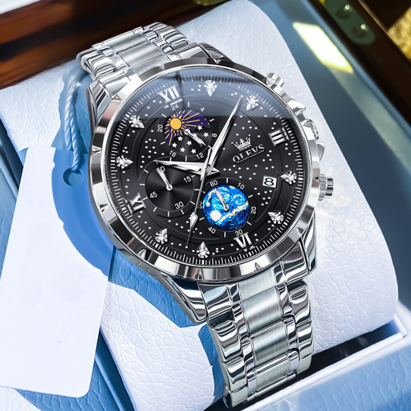 📅 Kalender & Mondphasen: Behalten Sie das Datum im Blick und genießen Sie die elegante Mondphasenanzeige, die einen Hauch von Raffinesse hinzufügt.