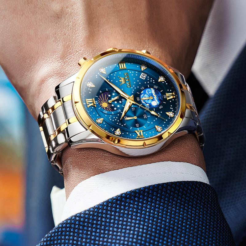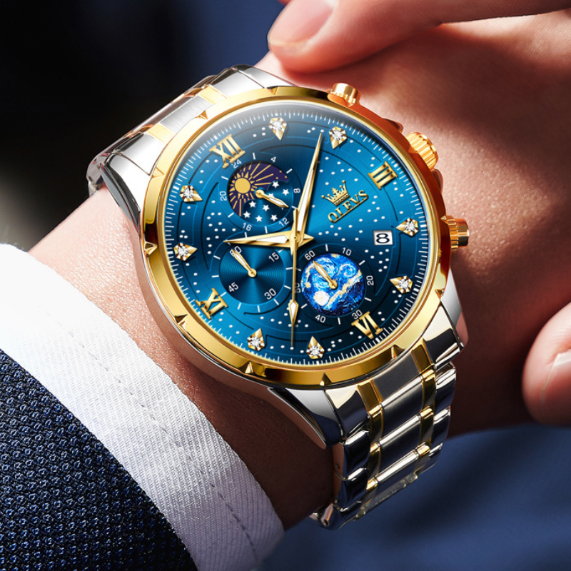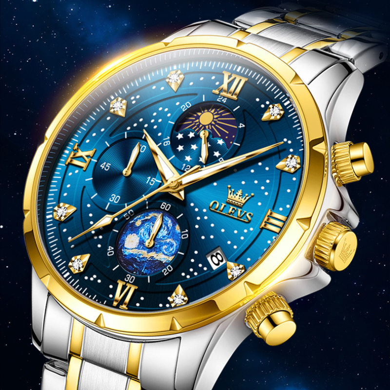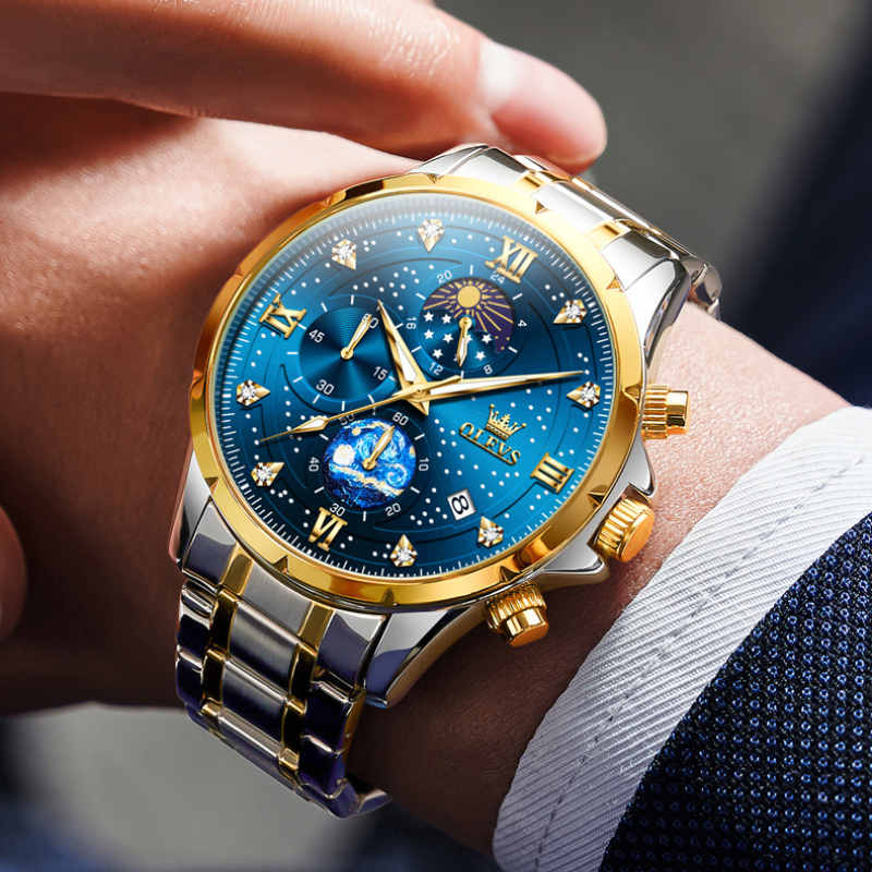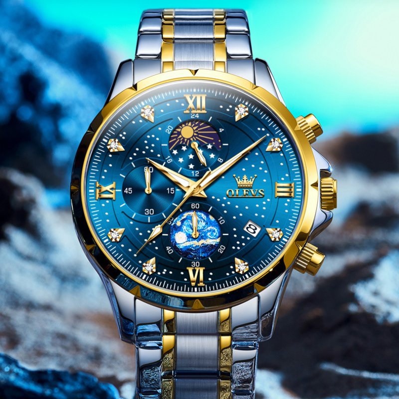 📅 Kalender & Mondphasen: Behalten Sie das Datum im Blick und genießen Sie die elegante Mondphasenanzeige, die einen Hauch von Raffinesse hinzufügt.